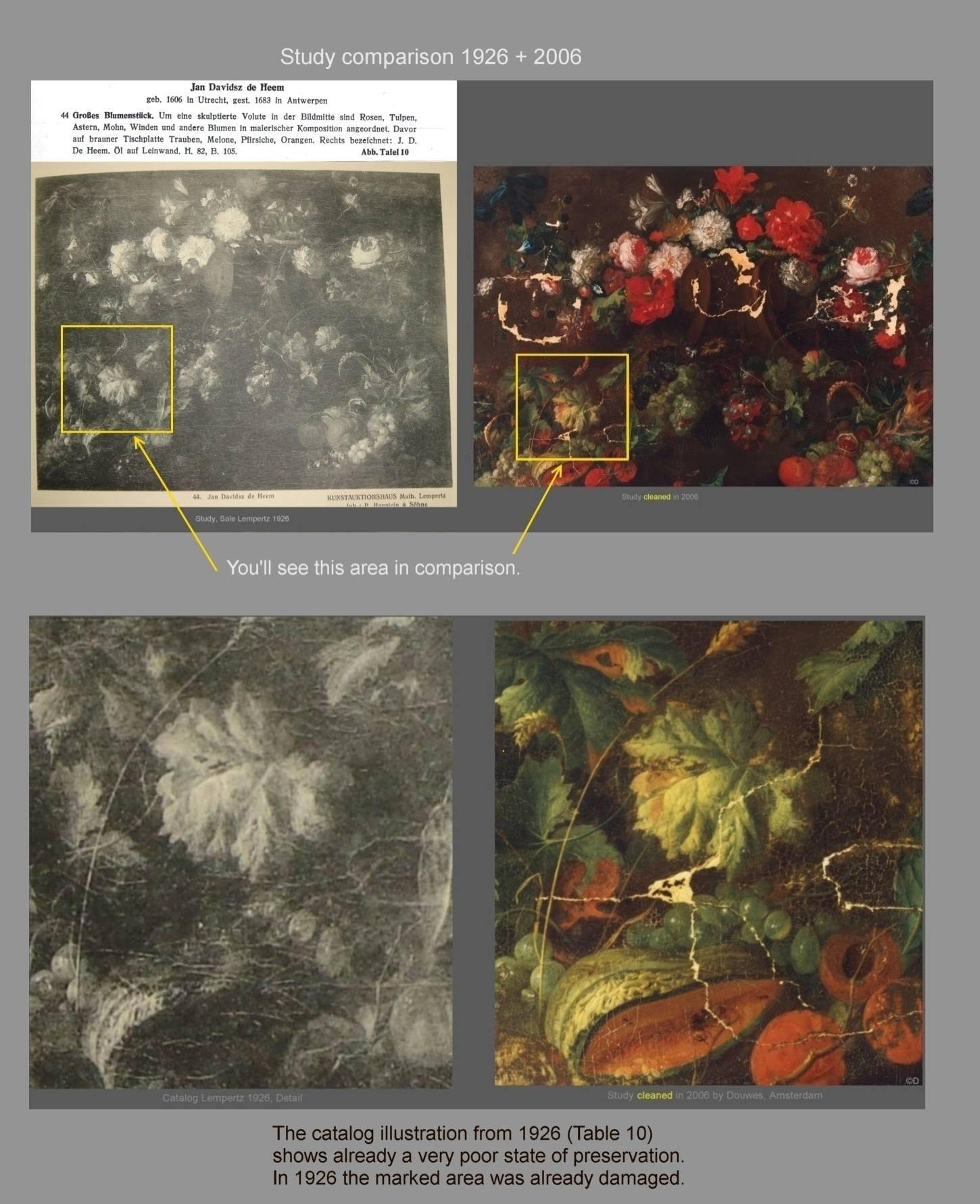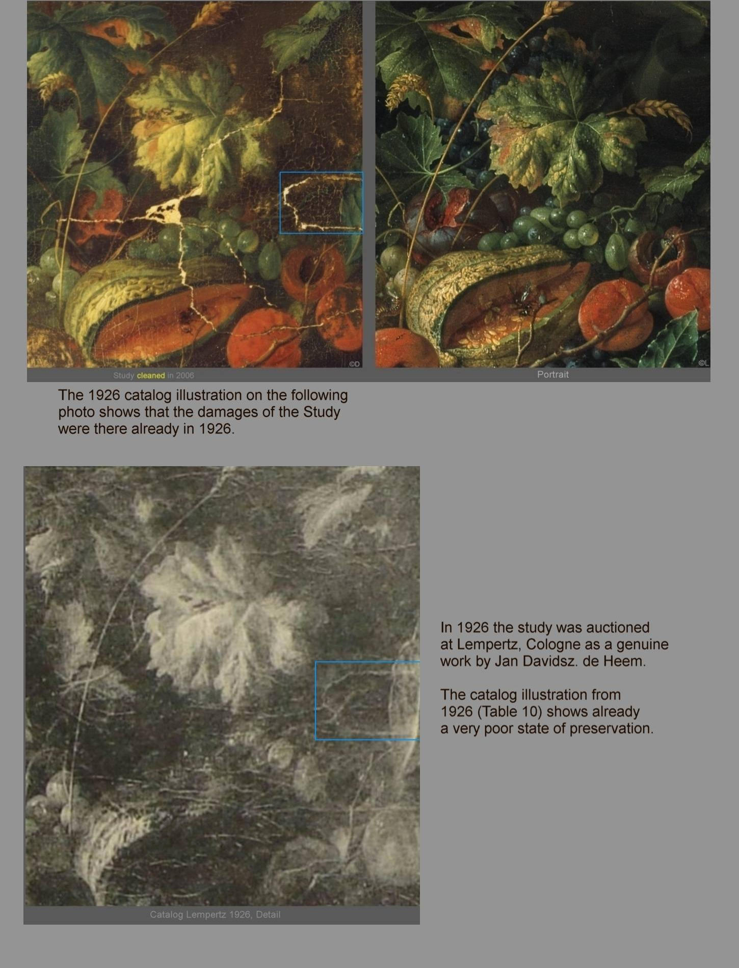 In the year 1926, the Study was auctioned off at Lempertz, Cologne as a genuinework by Jan Davidsz. De Heem. The catalog illustration from 1926 (Table 10) shows already a very poor state of perservation.