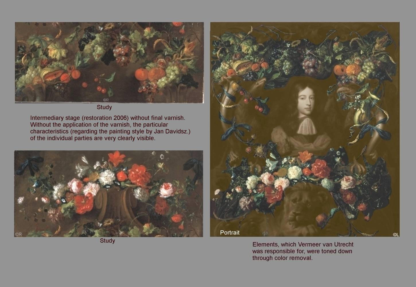 Han van Dam restaurateur restaurator nederland Jan Vermeer van Utrecht Kardinal Rijksbureau voor Kunsthistorische Documentatie RKD Archiv infrared investigation study (IRR-Osiris A1) Herzog Anton Ulrich-Museum, Braunschweig. responsible curators stated: there were no preparation sketches at all. Jan Davidsz. De Heem developed and changed his compositions directly on the canvas during the painting process. evidence Pentimenti Paeonia peregrina cornucopia foot anchoring point flowers garland. Orange-Nassau' (carried french army Louvre in 1795, Musée des Beaux Arts de Lyon appendant preliminary work portrait painting gift (Deal) William III. of Orange-Nassau, Governor of the Netherlands, King of England, Scotland and Ireland in 1672 (as William II. and "King Billy"). few secured works. facsimile signature publication: Dr. Hugo Toman: Ueber die Malerfamilie de Heem,: Repetitorium für Kunstwissenschaft 1888(Arnold Houbraken, De groote schouburgh der Nederlantsche konstschilders). Premier Commissaire Raschke Antwerpen Friedrich August I. von Sachsen August der Starke 1670-1733 Gemäldegalerie Dresden Sam Segal, Amsterdam Friedrich August I of Saxony, called August the Strong ( 1670- 1733) Netherlands infra-red examination Prof. Dr. Claus Grimm Douwes Fine Art Amsterdam Oeuvre catalogue Fred G. Meijer Italian collector Don Antonio Ruffo noble family collection in Messina, Sicily, Baroque art, Rembrandt van Rijn In depth technical study- Artist - Jan Davidsz. De Heem techniques and brushwork - Flemish Baroque art.
